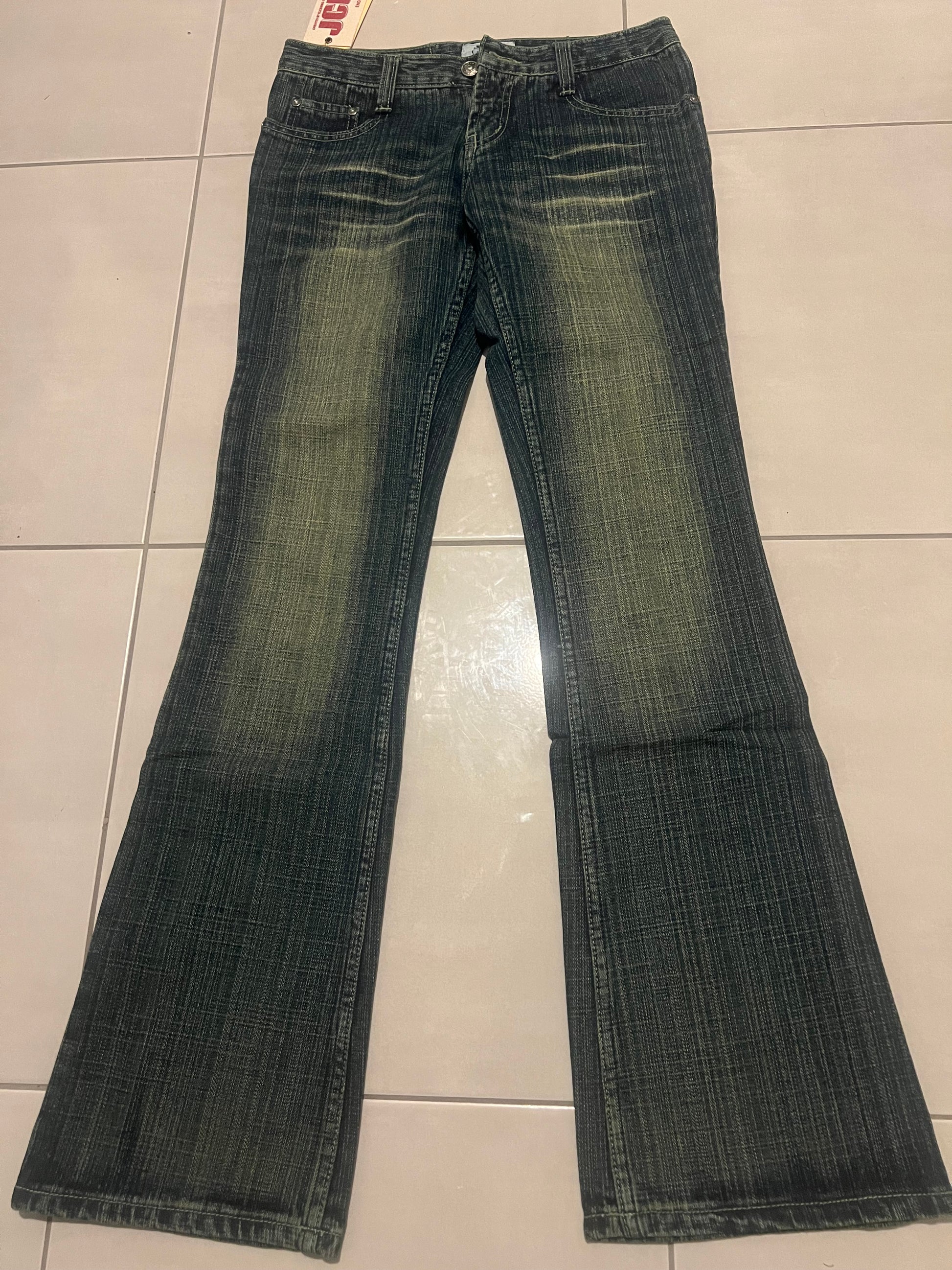 The denim has a vertical striation texture, with a yellow- olive fade effect on the front and back thighs, giving it a rugged, woven appearance. Low rise