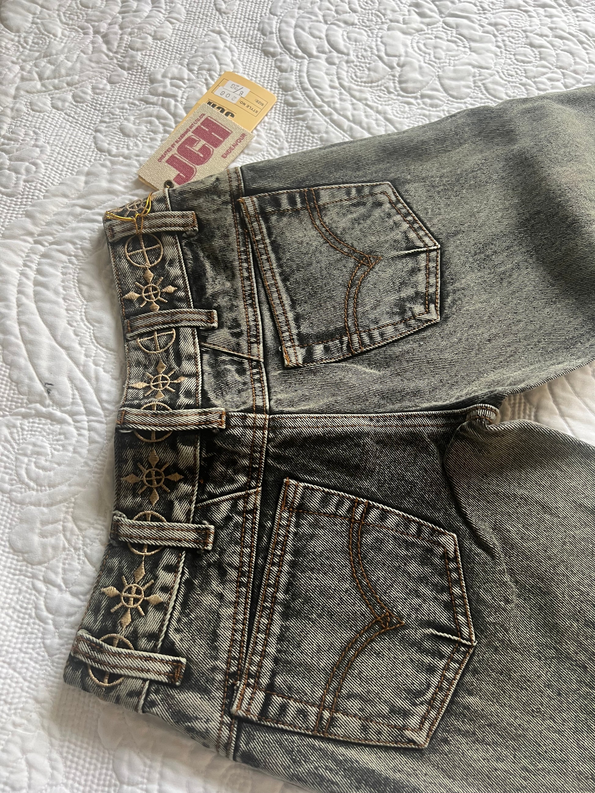 A low -rise black wash denim with a bold and unique embroidery pattern around the entire waistband and upper hip area, both front and back that gives a striking vintage effect.